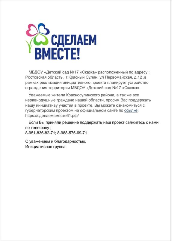 Детский сад №17 «Сказка» был открыт 6 марта 1975 года как ясли – сад на 6 групп и находился в ведомстве Сулинского металлургического завода. В 1995 году он был передан в муниципальную собственность г. Красный Сулин и переименован в МДОУ д\с №17 «Сказка» . Первым заведующим была назначена Мария Игнатьевна Иванова, участница ВОВ, связистка первого украинского фронта. При подборе коллектива она большое внимание уделяла не только профессиональным данным, но и наличию у них творческого потенциала .В результате сложился стабильный, творческий, высокопрофессиональный коллетив , перед которым была поставлена задача – создать для детей условия, как в сказке. Созвучен с задачей и выбранный коллективом девиз детского учреждения: «Пусть словно в сказке на планете живут и взрослые и дети !»